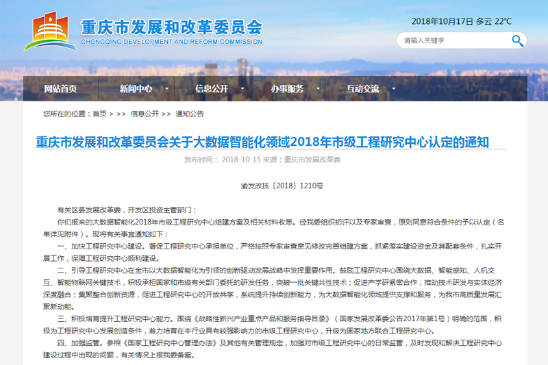 10月15日,重庆市发展和改革委员会发布《关于大数据智能化领域2018年市级工程研究中心认定的通知》,由beat365软件工程学院牵头申报的“多维数据感知与智能识别重庆市工程研究中心”获得认定;beat365马新强博士作为副主任参与申报的“区域医疗大数据智能化重庆市工程研究中心”也同批获得认定。