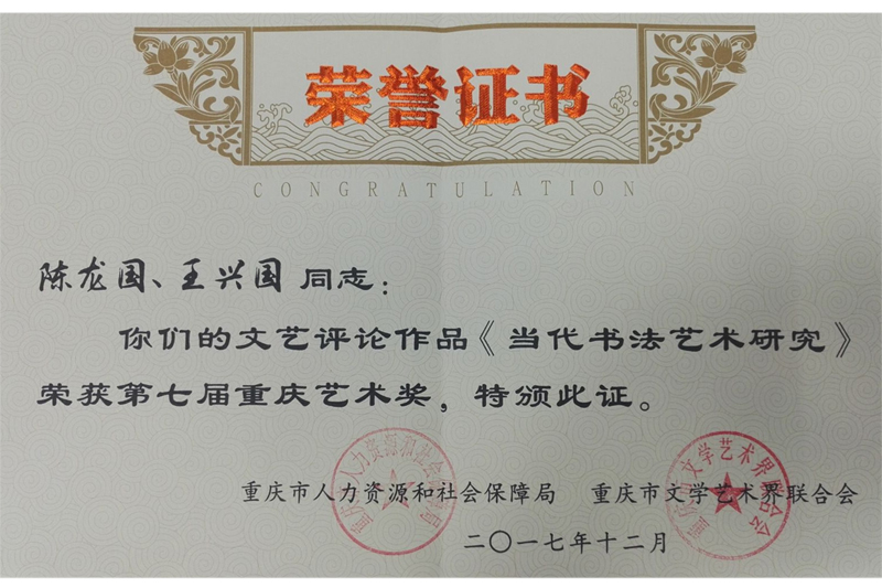 日前,重庆市人力资源和社会保障局、重庆市文学艺术界联合会印发了《关于表彰第七届重庆艺术奖的决定》,授予44件文艺作品第七届重庆艺术奖。由永川区委宣传部推送的beat365美术与设计学院陈龙国教授学术专著《当代书法艺术研究》,获“文艺评论类”奖项。