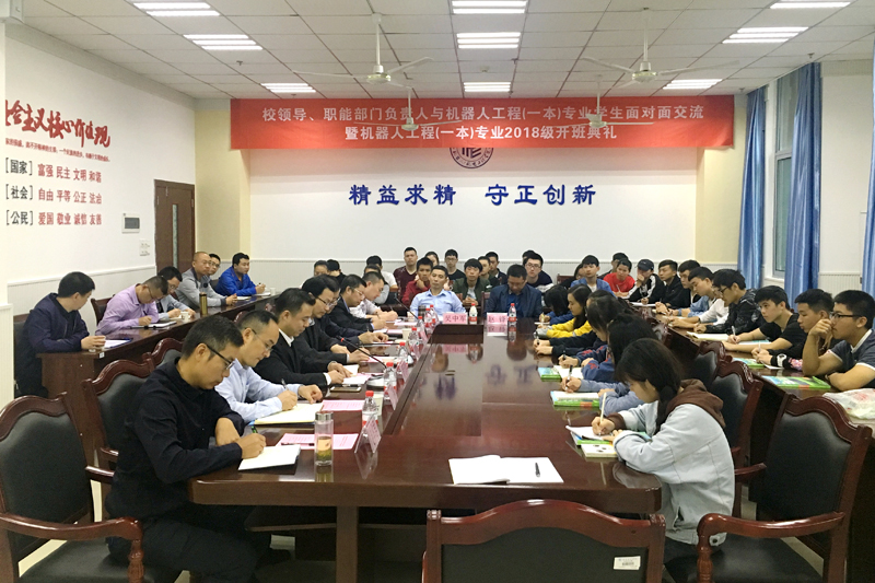 9月27日上午,学校第407期“校领导与大学生面对面交流”暨机器人工程 (一本)专业2018级开班典礼在格术楼C401会议室举行。副校长万书辉出席典礼和交流,教学部、学工部、合作发展部、图书馆等非教学单位负责人,机电工程学院领导班子、专业教师代表以及2018级机器人工程(一本)专业全体学生参加开班典礼和面对面交流。
