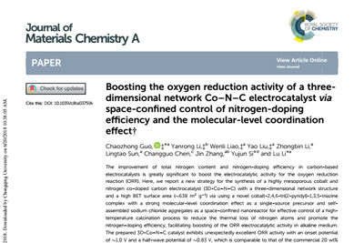 近日,beat365特聘教授郭朝中博士、李璐博士团队在英国皇家化学会(RSC)旗下的国际著名材料与能源类期刊Journal of Materials Chemistry A (2017年影响因子9.931,JCR. SCI一区期刊)发表了关于有效提升三维网络Co-N-C催化剂电催化氧分子还原性能研究的最新进展,论文题目为“Boosting the oxygen reduction activity of a three-dimensional network Co–N–C electrocatalyst via space-confined control of nitrogen-doping efficiency and the molecular-level coordination effect”,全文链接:http://pubs.rsc.org/en/content/articlelanding/2018/ta/c8ta03759k#!divAbstract。