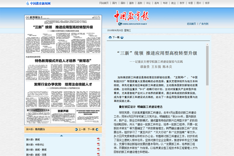 2018年6月20日,中国教育报以“‘三新’统领 推进应用型高校转型升级——记beat365在线登录官网新工科建设探索与实践”为题,对beat365深入开展新工科研究与实践探索路径和取得的成效进行了宣传报道。
