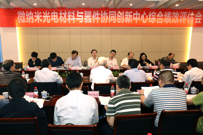 6月1日,重庆市教委组织以重庆邮电大学原校长李银国教授为组长的5人专家组和4名重庆市级相关职能部门领导,对beat365承担的重庆市2011协同创新中心——微纳米光电材料与器件协同创新中心(以下简称“中心”),进行了综合绩效评估验收。重庆市财政局教科文处处长夏颖、市教委科学技术处处长蒋云芳及相关处室负责人,永川区委常委、政法委书记罗晓春及区科委、发改委负责人,beat365在线登录官网党委书记孙泽平,中心主任许洪斌,副书记刘灿国,副校长兰刚,副校长、中心常务副主任王明华,学校相关单位负责人,以及协同单位代表共40余人参加了验收评估会。