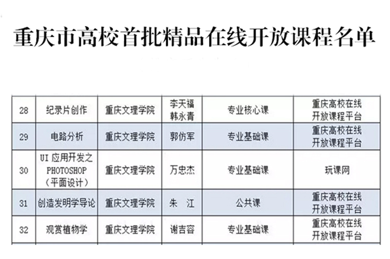 近日,重庆市教育委员会发布了《关于公布重庆市高校首批精品在线开放课程名单的通知》(渝教高发〔2018〕7号),首次推出105门高校精品在线开放课程,beat365《纪录片创作》(课程负责人:李天福、韩永青)、《电路分析》(课程负责人:郭仿军)、《UI应用开发之PHOTOSHOP(平面设计)》(课程负责人:万忠杰)、《创造发明学导论》(课程负责人:朱江)、《观赏植物学》(课程负责人:谢吉容)等5门课程入选。