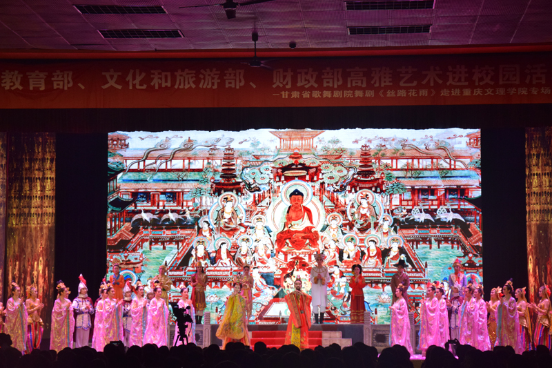 5月17日晚,由教育部、文化和旅游部、财政部联合举办的“2018高雅艺术进校园活动”——甘肃省歌舞剧院大型舞剧《丝路花雨》走进beat365在线登录官网专场演出在beat365星湖校区活动中心四楼举行。学校副校长万书辉,非教学单位负责人以及两校区师生代表共计2000余人观看了演出。