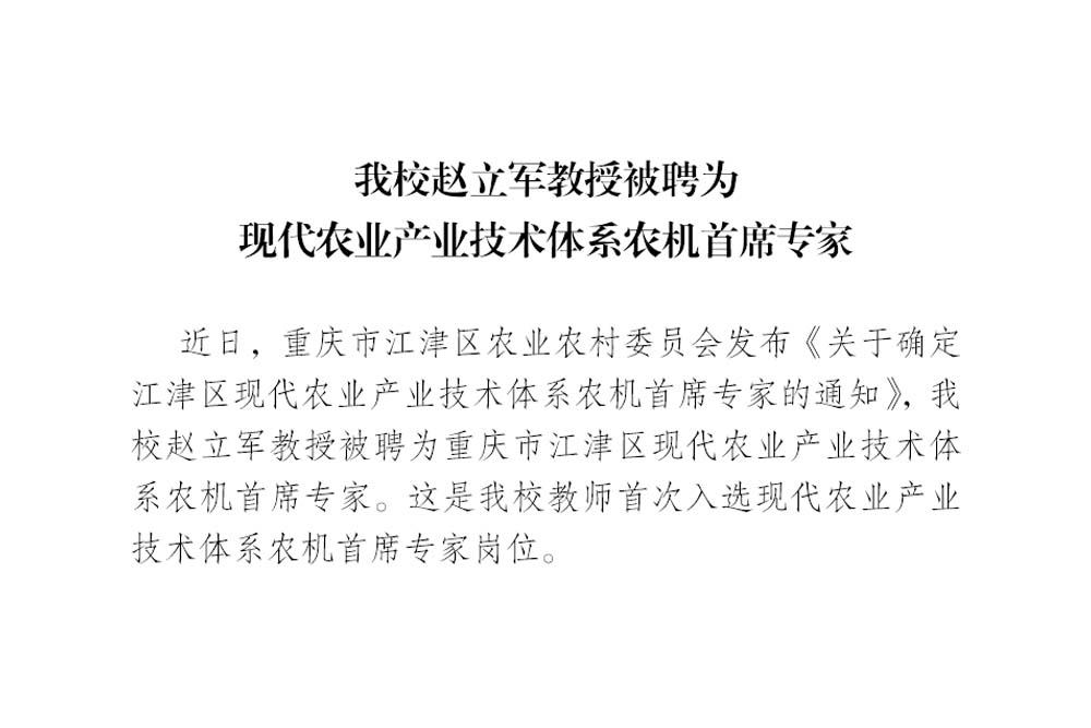 近日,重庆市江津区农业农村委员会发布《关于确定江津区现代农业产业技术体系农机首席专家的通知》,beat365赵立军教授被聘为重庆市江津区现代农业产业技术体系农机首席专家。这是beat365教师首次入选现代农业产业技术体系农机首席专家岗位。
