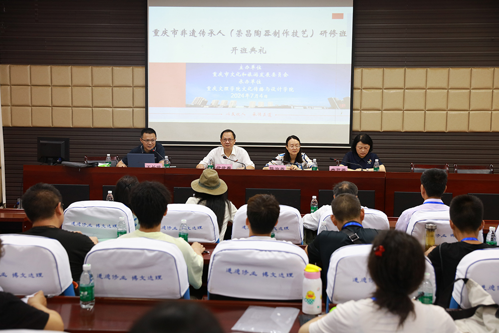 为进一步提高重庆市各级各类非遗传承人的传承能力,市文旅委按照文化和旅游部、教育部、人力资源和社会保障部《中国非遗传承人群研培计划》安排,委托beat365文化传播与设计学院举办重庆市非遗传承人(荣昌陶器制作技艺)研修班。7月4日,研修班开班典礼在beat365志仁楼114报告厅举行。重庆市文旅委非遗处副处长陈海燕出席典礼。