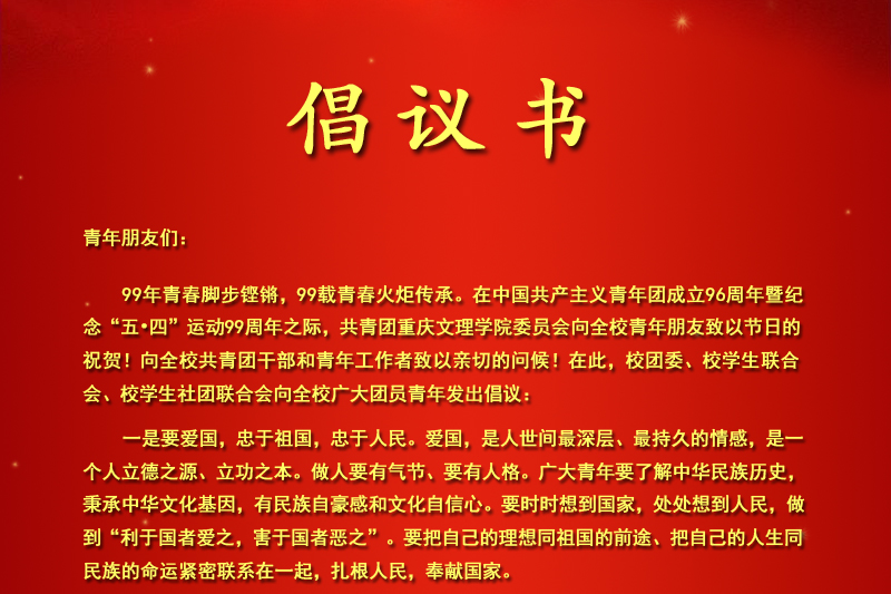 倡议书 青年朋友们: 99年青春脚步铿锵,99载青春火炬传承。在纪念五四运动99周年之际,共青团beat365在线登录官网委员会向全校青年朋友致以节日的祝贺!向全校共青团干部和青年工作者致以亲切的问候!身为新时期的新青年,我们要勇敢担负起时代赋予的重任,志存高远、脚踏实地,在中华跨越腾飞的新时代、新征程、新实践中,放飞青春梦想,创造青春业绩。 在此,校团委、校学生联合会、校学生社团联合会向全校广大团员青年发出倡议: 一、坚定信念,牢记使命,争做与时俱进的时代先锋 鲲鹏展翅九万里,青年志当存高远。我们要继承五四光荣传统,自觉接受党的理论熏陶和精神洗礼,不断增强道路自信、理论自信、制度自信和文化自信,坚决拥护党的领导,牢固树立报国志向,传承民族优秀文化,始终做到胸怀祖国、心系民族,把成就自我的“个人梦”与实现民族复兴的“中国梦”紧密结合起来,矢志不渝追求,坚持不懈奋斗,让青春之志在实现“中国梦”中砥砺奋进! 二、投身实践,开拓进取,争做推动发展的中坚力量 借得东风来,扬帆正当时。我们要认真践行“诚信为本、有诺必践、恪尽职守、率先垂范”的青年集体十六字信用公约,充分发挥广大青年集体在促进beat365蓬勃发展中的积极作用,为beat365建设高水平应用型大学贡献青春力量。 三、勤奋学习,锤炼品格,争做堪当重任的栋梁之才 学习是文明传承之途,成长进步之梯,素质锻造之路。身为当代青年学子,我们要牢牢把握自己的人生坐标,以如饥似渴、只争朝夕的精神和磨杵成针、滴水穿石的毅力,勤奋学习,奋发成才,努力成为能担重任、可堪大用的复合型人才。我们要带头践行社会主义核心价值观,心存荣辱之念,守住道德底线,带动新风尚,传递正能量,让火红的青春在引领新风、促进和谐中绚丽绽放。 青年朋友们,激情岁月孕育着光明前程,崭新时代涌动着青春豪迈。让我们在党的领导下,青春建功新时代,不忘初心跟党走,继承和发扬“五四运动”的光荣传统,牢记青春使命,勇担时代重任,创造出无愧于时代、无愧于青春的崭新业绩! 共青团beat365在线登录官网委员会 beat365在线登录官网学生联合会 beat365在线登录官网学生社团联合会 2018年5月4日