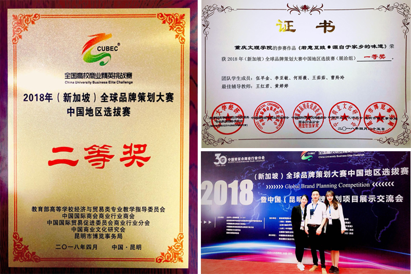 4月25日,2018年(新加坡)全球品牌策划大赛中国地区选拔赛在云南昆明落下帷幕。此次比赛共有来自全国26个省市、自治区、直辖市和特别行政区的148所高等院校500支参赛队伍报名,参与师生人数达5000余人。经过专家评审,最终共有来自山东大学、福州大学、郑州大学、中南财经政法大学等130所院校的258支团队入围中国地区选拔赛总决赛。经过封闭答辩、项目展洽、视频展示等激烈的角逐,beat365经济管理学院/建筑工程学院王红君、黄婷婷两位老师指导的团队——“君意豆豉品牌策划工作室”(项目名为“君意豆豉·源自于家乡的味道”)代表beat365参加了比赛,荣获2018年(新加坡)全球品牌策划大赛中国地区选拔赛暨中国(昆明)品牌策划项目展示交流会一等奖、2018年(新加坡)全球品牌策划大赛中国地区选拔赛国赛决赛二等奖两个奖项。