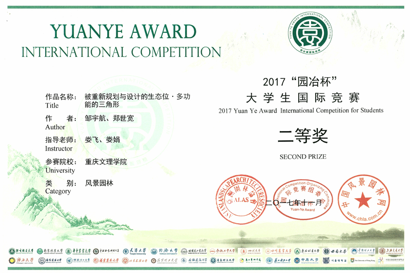 3月23日,第八届园冶高峰论坛暨亚洲园林大会在北京召开,大会除了进行演讲交流外还隆重的举行了2017年度“园冶杯”大学生国际竞赛颁奖盛典。beat365林学与生命科学学院娄娟教授、娄飞高级工程师带领的学生创意设计团队在本项竞赛中获得佳绩,荣获二等奖2项、优胜奖1项,实现了园林专业在国际竞赛中奖项零的突破。其中,“被重新规划与设计的生态位·多功能的三角形”和“呼吸的梯道山地空间景观概念再造”分别获得毕业设计组别二等奖和课程设计组别二等奖,“穿越时空的雕塑——重庆永川兵工厂旧址景观更新设计”获得课程设计组别荣誉奖。beat365林学与生命科学学院获得大赛组委会颁发的“先进集体奖”和“优秀组织奖”。
