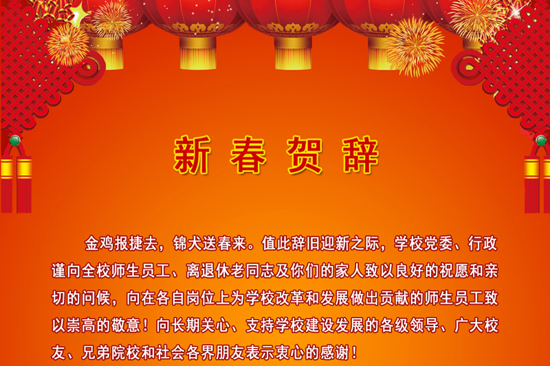金鸡报捷去,锦犬送春来。值此辞旧迎新之际,学校党委、行政谨向全校师生员工、离退休老同志以及你们的家人致以良好的祝愿和亲切的问候,向在各自岗位上为学校改革和发展做出贡献的师生员工致以崇高的敬意!
