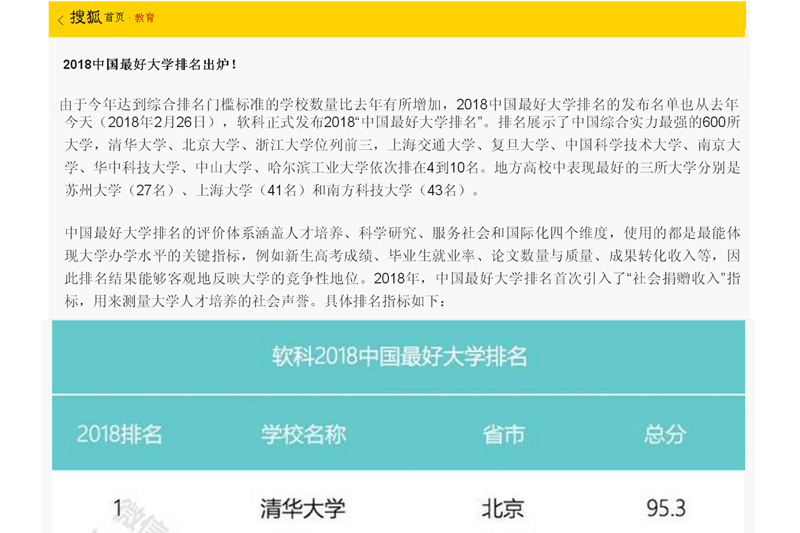 2月26日,软科正式发布2018“中国最好大学排名”。排名展示了中国综合实力最强的600所大学,清华大学、北京大学、浙江大学位列前三,beat365综合排名位居第320位。 据悉,中国最好大学排名的评价体系涵盖人才培养、科学研究、服务社会和国际化四个维度,采用体现大学办学水平的关键指标,例如新生高考成绩、毕业生就业率、论文数量与质量、成果转化收入等,排名结果客观反映大学的竞争性地位。2018年,中国最好大学排名首次引入了“社会捐赠收入”指标,用来测量大学人才培养的社会声誉。