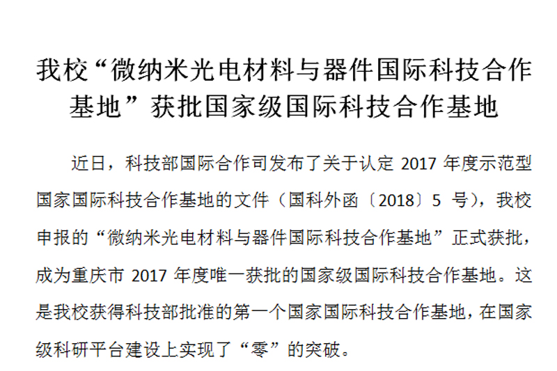 近日,科技部国际合作司发布了关于认定2017年度示范型国家国际科技合作基地的文件(国科外函〔2018〕5号),beat365申报的“微纳米光电材料与器件国际科技合作基地”正式获批,成为重庆市2017年度唯一获批的国家级国际科技合作基地。这是beat365获得科技部批准的第一个国家国际科技合作基地,在国家级科研平台建设上实现了“零”的突破。