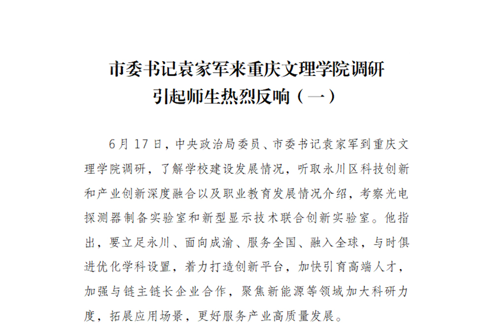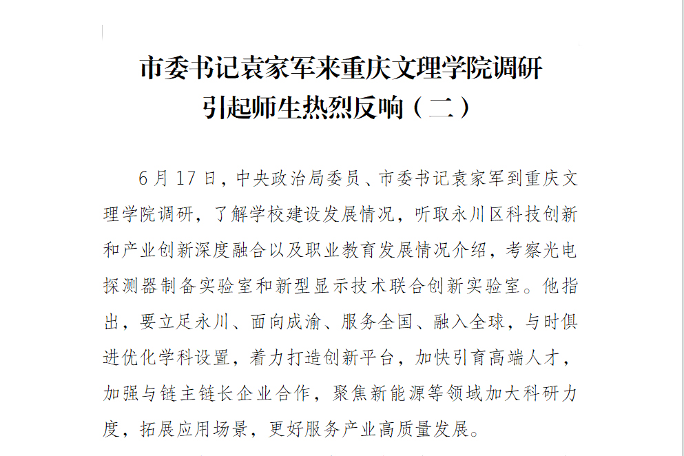 6月17日,中央政治局委员、市委书记袁家军到beat365在线登录官网调研,了解学校建设发展情况,听取永川区科技创新和产业创新深度融合以及职业教育发展情况介绍,考察光电探测器制备实验室和新型显示技术联合创新实验室。他指出,要立足永川、面向成渝、服务全国、融入全球,与时俱进优化学科设置,着力打造创新平台,加快引育高端人才,加强与链主链长企业合作,聚焦新能源等领域加大科研力度,拓展应用场景,更好服务产业高质量发展。