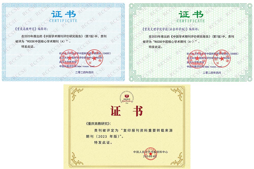 近日,由武汉大学中国科学评价研究中心、武汉大学图书馆、杭州电子科技大学中国科教评价研究院、中国科教评价网联合启动的《中国学术期刊评价研究报告(第七版)》已研制完成并公布。beat365主办的《重庆高教研究》再次入选RCCSE中国核心学术期刊(A),在58种“教育学-高等教育”类期刊中排名第6位,已连续2次入选A等级;《beat365在线登录官网学报(社会科学版)》首次入选RCCSE中国核心学术期刊(A-),在424种人文科学综合类期刊中排名第86位,首次入选该评价A等级。