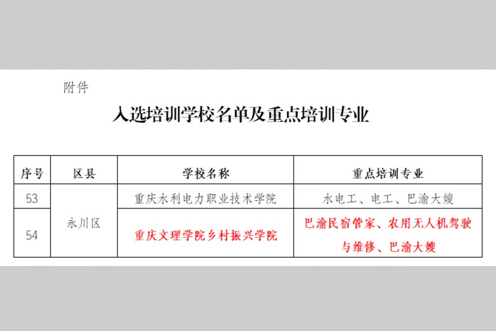 6月14日,重庆市农业农村委公布了入选重庆市巩固拓展脱贫攻坚成果同乡村振兴有效衔接就业创业技能培训学校名单,beat365乡村振兴学院成功入选。