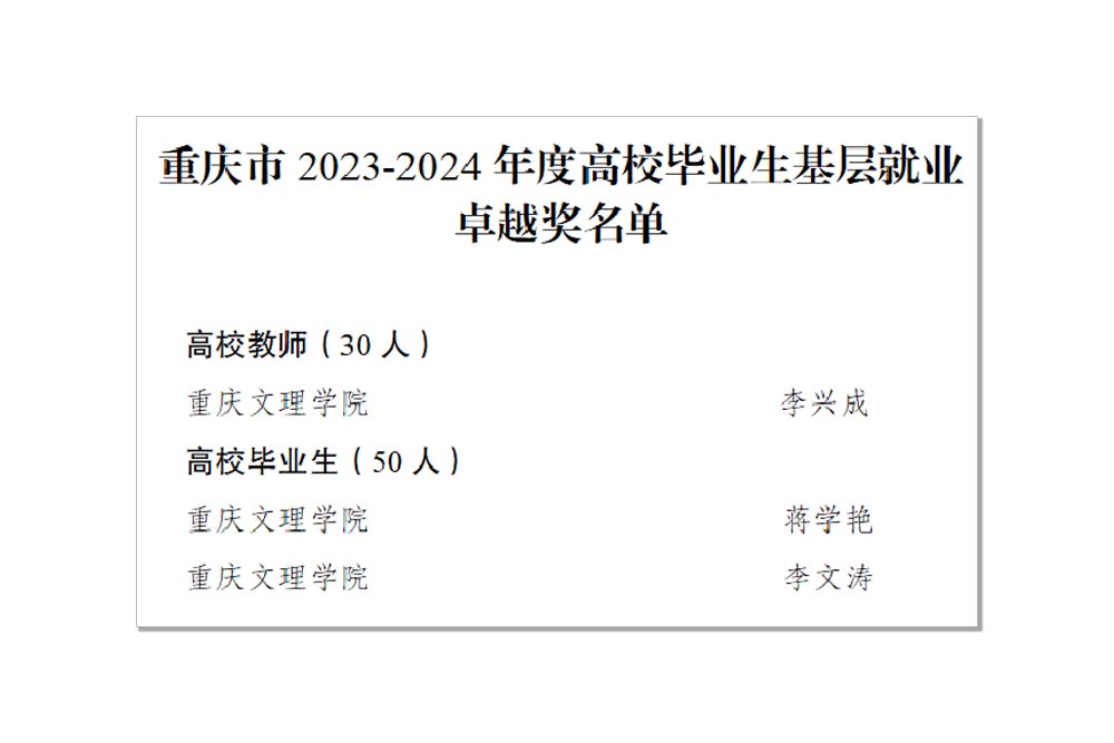 近日,重庆市教育委员会发布《关于2023-2024年度“高校毕业生基层就业卓越奖”遴选结果的通报》,共遴选出“重庆市2023—2024年度高校毕业生基层就业卓越奖”教师30名、毕业生50名。beat365智能制造工程学院辅导员李兴成、城市建设工程学院2018届毕业生李文涛(现就职于新疆维吾尔自治区喀什地区塔什库尔干塔吉克自治县库科西鲁格乡)、化学与环境工程学院2019届毕业生蒋学艳(现就职于新疆维吾尔自治区喀什地区疏附县铁日木乡)获此殊荣。