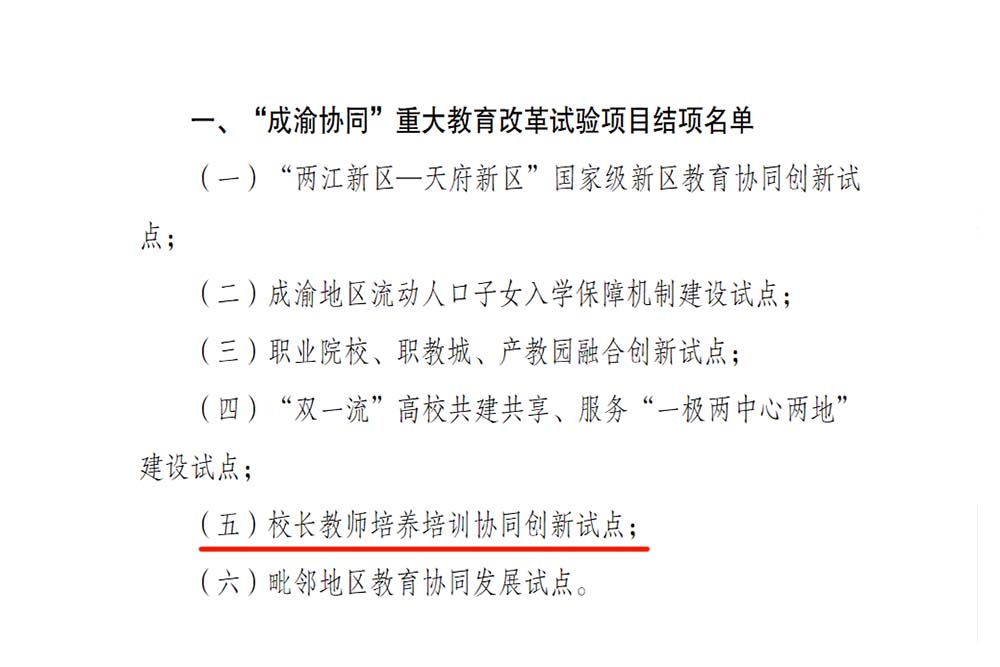 近日,重庆市教育委员会与四川省教育厅联合下发通知,公布了“成渝协同”重大教育改革试验项目的结项评审结果。beat365与重庆师范大学、重庆三峡学院等市内5所高校共同承担的“校长教师培养培训协同创新试点项目(教师教育)”顺利结项。beat365同时获评“成渝协同”重大教育改革试验项目优秀试点单位,成为全市获此殊荣的五所普通本科高校之一。