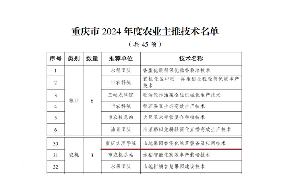 近日,重庆市农业农村委发布《重庆市2024年农业主推技术公示名单》,按照聚焦现代山地特色高效农业和绿色低碳循环发展、紧扣稳粮保供和提质增效两大目标要求,市农业农村委遴选了粮油、经作、蔬菜、畜牧、水产、农机、加工、生态、病虫害防治和质量安全等类别农业主推技术45项。beat365赵立军教授主持的“山地果园智能化除草装备及应用技术”入选,这是beat365连续第二年入选重庆市农业主推技术名单,是beat365在农机类别领域又一次新突破。