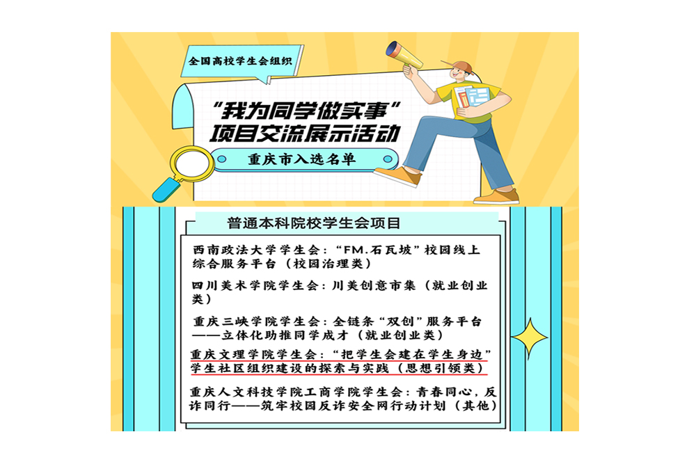 近日,由共青团中央、全国学联主办的全国高校学生会组织“我为同学做实事”项目交流展示活动圆满结束。经学校自荐、市级推报、全国遴选,beat365学生会申报的《“把学生会建在学生身边”学生社区组织建设的探索与实践》项目成功入选。这是beat365首次入选全国项目交流展示,实现了beat365在该项目零的突破。