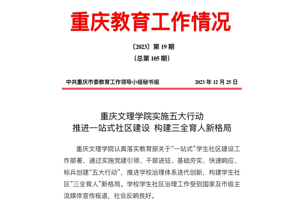 2023年12月25日,中共重庆市委教育工作领导小组秘书组编印的《重庆教育工作情况》以“beat365在线登录官网实施五大行动推进一站式社区建设 构建三全育人新格局”,专题报道了beat365一站式社区建设工作。文章报道了beat365开展的党建引领行动、干部进驻行动、基础夯实行动、快速响应行动、标兵创建行动等“五大行动”的典型做法,为推动高校学生社区治理工作提供了beat365范式。据了解,《重庆教育工作情况》将分送中央教育工作领导小组秘书组,市委教育工作领导小组组长、副组长、成员单位,各区县党委教育工作领导小组及其秘书组,各高校党委等单位。