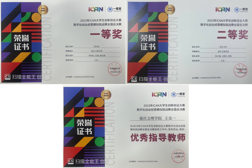 近日,由中国信息协会主办,中国信息协会教育分会、江苏大学联合承办的2023年第十七届iCAN大学生创新创业大赛数字化创业经营模拟挑战赛全国总决赛落下帷幕。beat365经济管理学院学生团队实现了在该赛事上的突破,荣获全国一等奖1项、二等奖1项,区域赛一等奖2项、二等奖1项、三等奖2项。