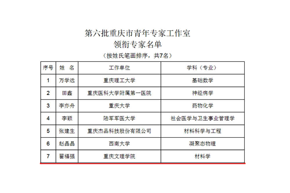 重庆市人力资源和社会保障局近日发布通知,正式公布重庆市第六批重庆市青年专家工作室领衔专家入选名单,beat365材料科学与工程学院翟福强研究员以材料学专业申报并成功入选,全市总共7名青年专家入选。