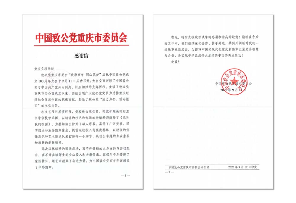 近日,中国致公党重庆市委员会向学校发来感谢信,感谢beat365致公党党员、师范学院教师赵思宇带领的学校管乐团,以精湛的技艺和饱满的激情精彩演绎了《我和我的祖国》,为中国