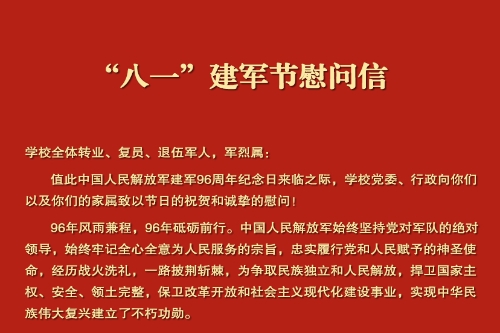 学校全体转业、复员、退伍军人,军烈属: 值此中国人民解放军建军96周年纪念日来临之际,学校党委、行政向你们以及你们的家属致以节日的祝贺和诚挚的慰问! 96年风雨兼程,96年砥砺前行。中国人民解放军始终坚持党对军队的绝对领导,始终牢记全心全意为人民服务的宗旨,忠实履行党和人民赋予的神圣使命,经历战火洗礼,一路披荆斩棘,为争取民族独立和人民解放,捍卫国家主权、安全、领土完整,保卫改革开放和社会主义现代化建设事业,实现中华民族伟大复兴建立了不朽功勋。 不同的岗位,一样的奋斗;不同的“战场”,一样的“冲锋”。在人生的不同阶段、不同岗位上,你们接续奋斗、砥砺前行,书写了不平凡的华章。beat365全体转业、复员、退伍军人坚持发扬人民军队的光荣传统和优良作风,深入学习贯彻习近平新时代中国特色社会主义思想,自觉增强“四个意识”,坚定“四个自信” ,做到“两个维护”;紧紧围绕学校中心工作,保持军人本色,立足本职岗位、勇于担当作为 ,在教书育人、管理育人、服务育人和学校建设发展中做出了新的贡献。 奋进新征程,扬帆再出发。当前,全党正在深入开展学习贯彻习近平新时代中国特色社会主义思想主题教育,学校正以习近平新时代中国特色社会主义思想为指导,全面贯彻党的二十大精神。下半年,学校即将召开第四次党代会,这是全校绘就美好未来新蓝图,共谋跨越发展新篇章的一次盛会。希望你们继续恪守一日是兵、终身是兵的铮铮誓言,继续保持退役不褪色、永远跟党走的忠诚品格,继续发扬爱国奋斗、岗位建功的昂扬风貌;以更加坚定的信心、更加高昂的斗志、更加务实的作风,全力以赴做好各项工作,为推动学校建设发展,为实现中华民族伟大复兴的中国梦再立新功。 祝同志们节日快乐、身体健康、工作顺利、阖家幸福! 中共beat365在线登录官网委员会 beat365在线登录官网 2023年8月1日