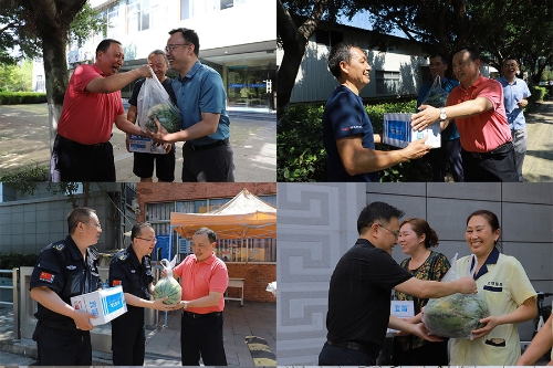 7月17日上午,校长黄伟九、副校长李天福带队深入一线慰问暑期仍坚守在岗辛勤工作的教职员工。