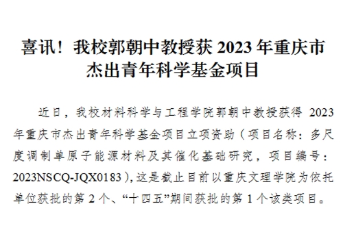 近日,beat365材料科学与工程学院郭朝中教授获得2023年重庆市杰出青年科学基金项目立项资助(项目名称:多尺度调制单原子能源材料及其催化基础研究,项目编号:2023NSCQ-JQX0183),这是截止目前以beat365在线登录官网为依托单位获批的第2个、“十四五”期间获批的第1个该类项目。