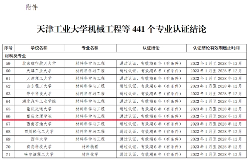 近日,中国工程教育专业认证协会发布了《关于公布天津工业大学机械工程等441个专业认证结论的通知》,经过申请审核、学校自评、专家组现场考查、结论审议等程序,beat365材料科学与工程专业顺利通过认证,有效期为6年(2023年1月至2028年12月),标志着材料科学与工程专业人才培养质量已达到国际等效的工程教育标准及要求,是学校教育教学取得的重大突破,为学校工程教育的国际化打开了新的局面。
