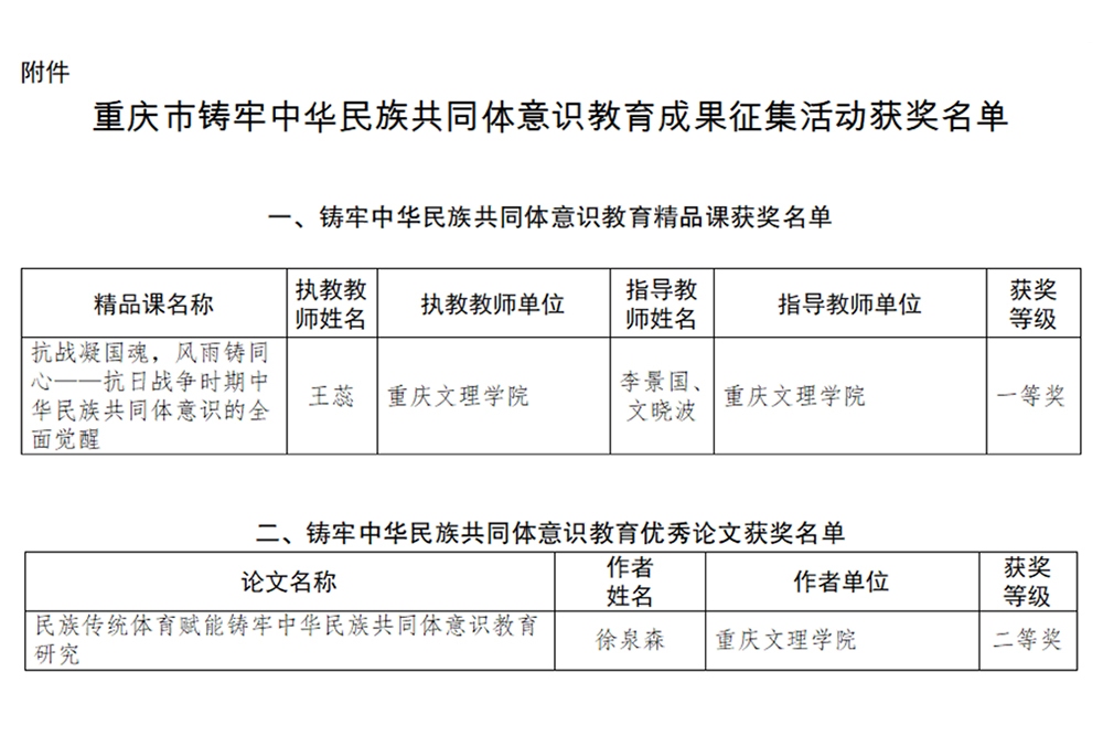 近日,市教委、市民族宗教委公布了重庆市铸牢中华民族共同体意识教育成果征集活动评选结果,beat365马克思主义学院教师王蕊执教的《抗战凝国魂,风雨铸同心——抗日战