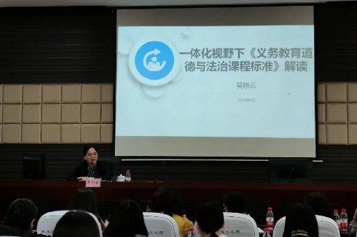 为深入开展学习贯彻习近平新时代中国特色社会主义思想主题教育,落实党的二十大报告提出的推进大中小学思想政治教育一体化建设精神,4月27日下午,学校邀请了北京师范大学博士生导师、教育部大中小学德育一体化国家教材建设重点研究基地副主任、教育部基础教育思想政治(道德与法治)教学指导专委会秘书长吴晓云来校开展专题辅导。报告会在培训学院114报告厅举行。永川区教科所教研员、20余所中小学校思政课教师、学校部分思政课教师、思想政治教育(师范)专业本科生聆听了报告,马克思主义学院相关负责人主持报告会。