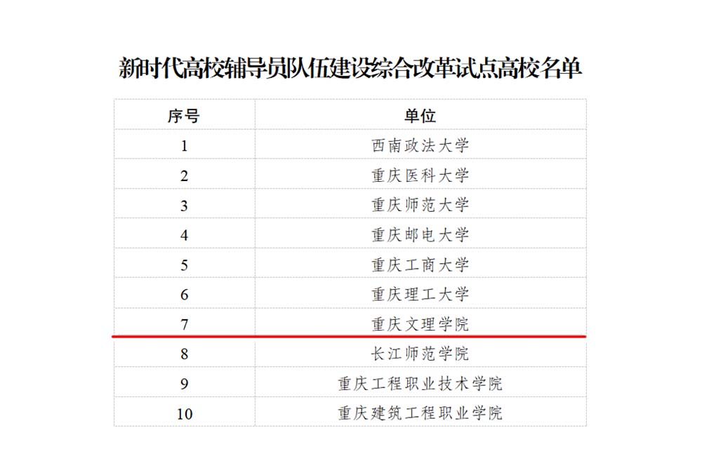 近日,中共重庆市委教育工委公布了新时代高校辅导员队伍建设综合改革试点单位名单,beat365成为全市入选的10所高校之一。这一荣誉不仅是对beat365辅导员队伍建设工作的肯定,更为beat365辅导员队伍的进一步发展提供了重要的契机。