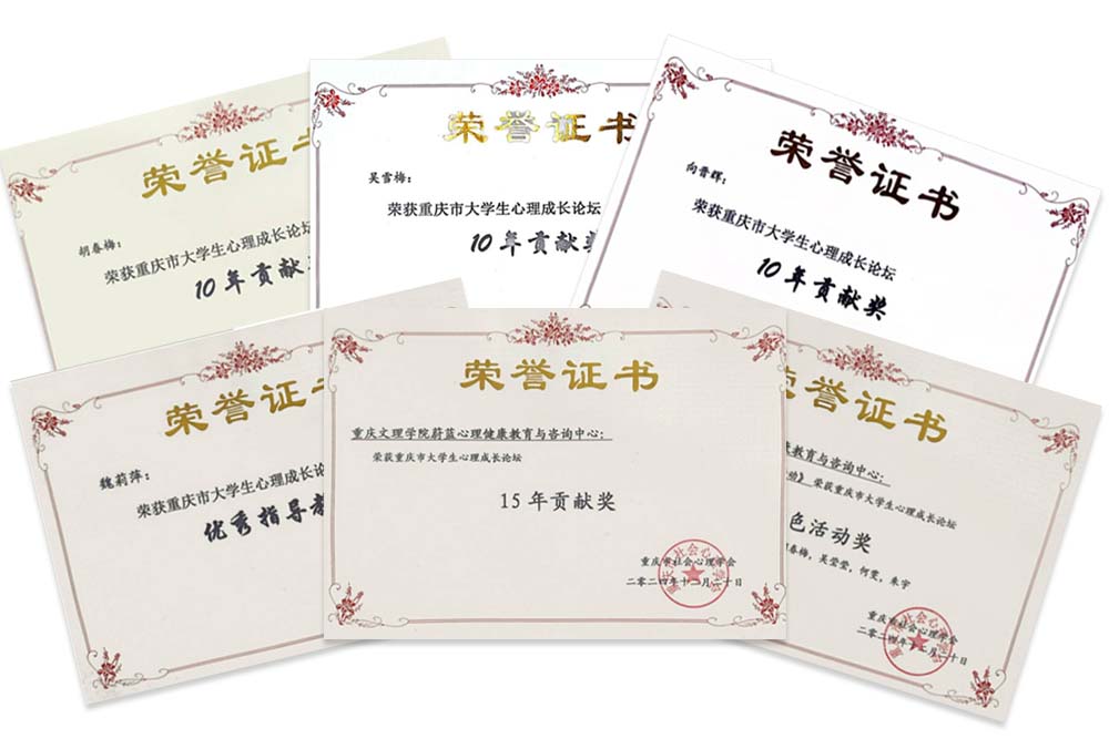 近日,由重庆市社会心理学会主办的“构建心理健康新生态,助力现代重庆新发展”2024年学术会议在西南大学圆满结束。会议表彰了在过去15年中为大学生心理健康与成长作出突出贡献的个人和团队。beat365蔚蓝心理健康教育与咨询中心获得重庆市大学生心理成长论坛15 年贡献奖(集体),胡春梅、吴雪梅、向晋辉分别获得重庆市大学生心理成长论坛10年贡献奖(个人),魏莉萍获得重庆市大学生心理成长论坛优秀指导教师,牟芷老师组织的《“心路同行”讲故事主题活动》被评为重庆市大学生心理成长论坛特色活动。