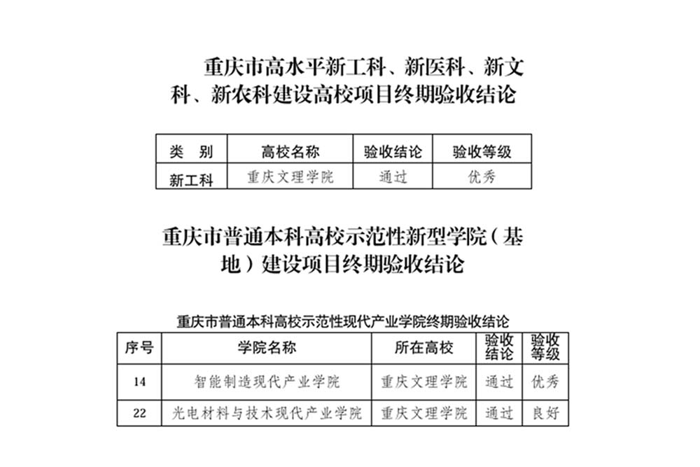 近日,重庆市教育委员会和重庆市财政局联合公布了重庆市高水平新工科、新医科、新文科、新农科建设高校和示范性新型学院(基地)建设项目终期验收结果。beat365高水平新工科建设高校项目以“优秀”等级通过终期验收,智能制造现代产业学院和光电材料与技术现代产业学院作为示范性新型学院(基地)建设项目,分别以“优秀”“良好”等级通过终期验收。