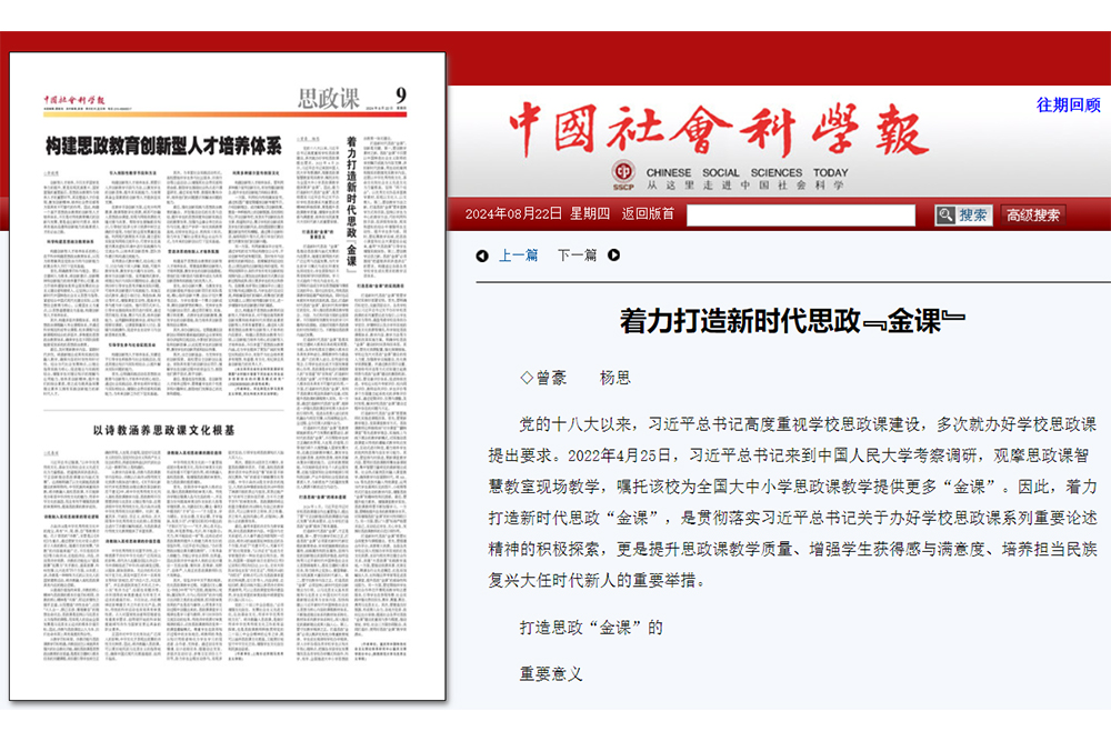 8月22日,《中国社会科学报》理论版“思政课”刊发beat365马克思主义学院曾豪副教授和陕西师范大学杨思署名文章《着力打造新时代思政“金课”》。该文刊发后被中国社会科学网等主流媒体全文转载。《中国社会科学报》是由中国社会科学院主管主办,中国社会科学杂志社编辑出版的面向全国哲学社会科学研究者和爱好者的大型理论、学术专业报纸。该报依托中国社会科学院深厚的学术积淀,旨在弘扬中国优秀的传统文化,发展繁荣中国特色哲学社会科学,致力于推动理论创新、学术繁荣,展现当代中国哲学社会科学前沿、趋势和最新成就。