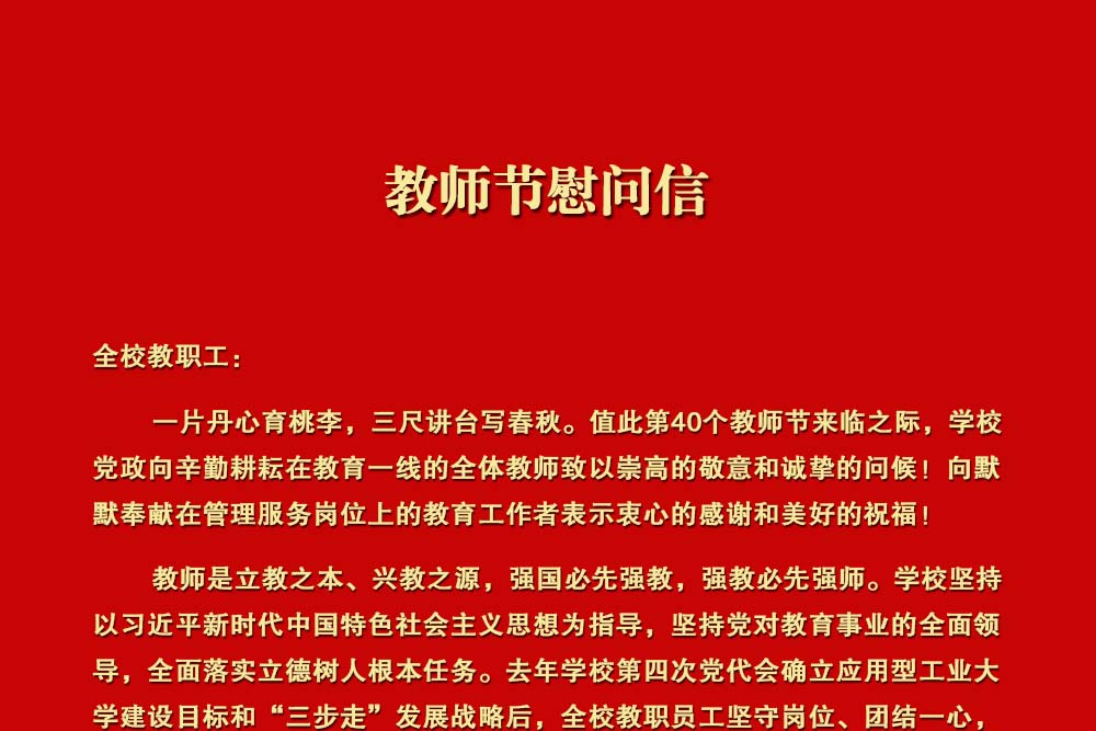 全校教职工: 一片丹心育桃李,三尺讲台写春秋。值此第40个教师节来临之际,学校党政向辛勤耕耘在教育一线的全体教师致以崇高的敬意和诚挚的问候!向默默奉献在管理服务岗位上的教育工作者表示衷心的感谢和美好的祝福! 教师是立教之本、兴教之源,强国必先强教,强教必先强师。学校坚持以习近平新时代中国特色社会主义思想为指导,坚持党对教育事业的全面领导,全面落实立德树人根本任务。去年学校第四次党代会确立应用型工业大学建设目标和“三步走”发展战略后,全校教职员工坚守岗位、团结一心,用智慧和爱心,在教育教学、学科科研、社会服务、文化传承等方面攻坚克难,这一年成绩斐然。学校获批重庆市普通本科高校产教融合特色优势专业群1个、“本科教学成果培育揭榜挂帅”专项项目2项,首次获得获教育部高等学校科学研究优秀成果奖二等奖。学校新增7个硕士学位授予点,新增4个省级科研平台,顺利通过武器装备科研生产单位二级保密资格认定。学生社区治理工作先后受到时任副市长商奎等各级领导表扬,治理成果在《重庆教育工作情况简报》刊发推广,受到“中国教育报”等主流媒体广泛报道,赢得社会高度评价;新生一本线上录取占51.5%,2024届毕业生初次去向落实率达89.7%。33人入选重庆市第四批学术技术带头人和后备人选,人才工作体制机制不断完善。市委书记袁家军到校调研,对学校的办学成绩给予肯定,要求立足永川、面向成渝、服务全国、融入全球,与时俱进优化学科设置,着力打造创新平台,加快引育高端人才。 站在新的起点上,我们斗志昂扬、我们责任更加重大。学校将深化教育综合改革,大力弘扬教育家精神,加强师资队伍建设,优化资源配置,构建高质量育人体制机制,努力培养更多让党放心、爱国奉献、担当民族复兴重任的时代新人。希望广大教职工,牢记为党育人、为国育才使命,坚定信心、奋发有为,真抓实干、开拓创新,在奋力谱写中国式现代化重庆篇章中作出更大贡献! 最后,祝愿全校教职工节日快乐,身体健康,工作顺利,阖家幸福! 中共beat365在线登录官网委员会 beat365在线登录官网 2024年9月10日