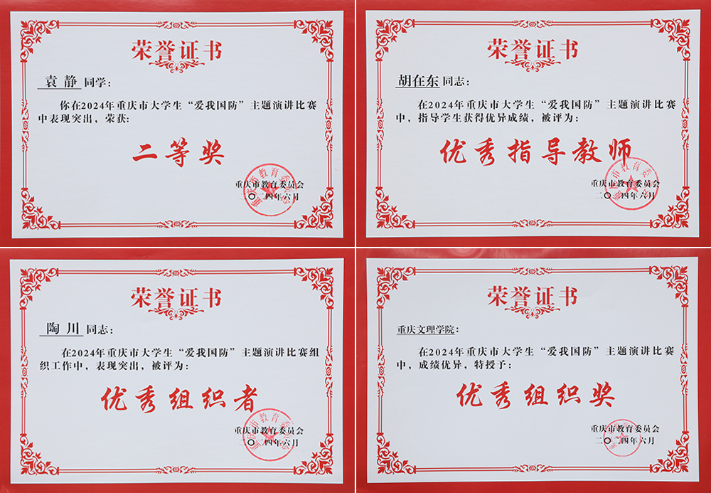 近日,重庆市教育委员会发布《关于2024年重庆市大学生“爱我国防”主题演讲比赛获奖情况的通报》(渝教体卫艺发〔2024〕7号),beat365师范学院2022级学生袁静荣获二等奖,胡在东荣获优秀指导老师,陶川荣获优秀组织者,学校荣获优秀组织奖。