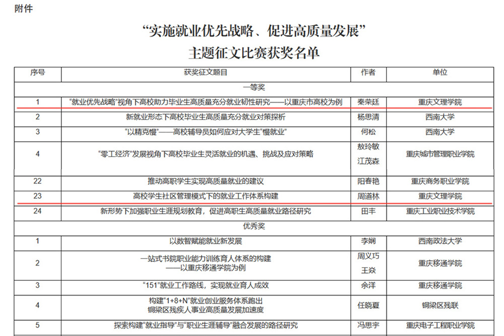 近日,重庆市人力资源和社会保障局、重庆市教育委员会公布全市“实施就业优先战略、促进高质量发展”主题征文比赛结果。beat365经济管理学院秦荣廷老师提交的征文《“就业优先战略”视角下高校助力毕业生高质量充分就业韧性研究——以重庆市高校为例》荣获一等奖,招生就业处周道林老师提交的征文《高校学生社区管理模式下的就业工作体系构建》荣获三等奖。