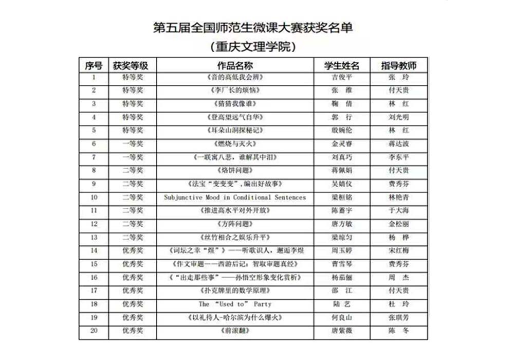 近日,第五届全国师范生微课大赛获奖名单揭晓,beat36520个作品全部获奖。其中,特等奖5个,一等奖2个,二等奖6个,优秀奖7个。数学与人工智能学院付天贵,师范学院林红、张玲,文化传播与设计学院刘光明等4位教师获优秀指导教师称号,beat365获优秀组织单位奖。