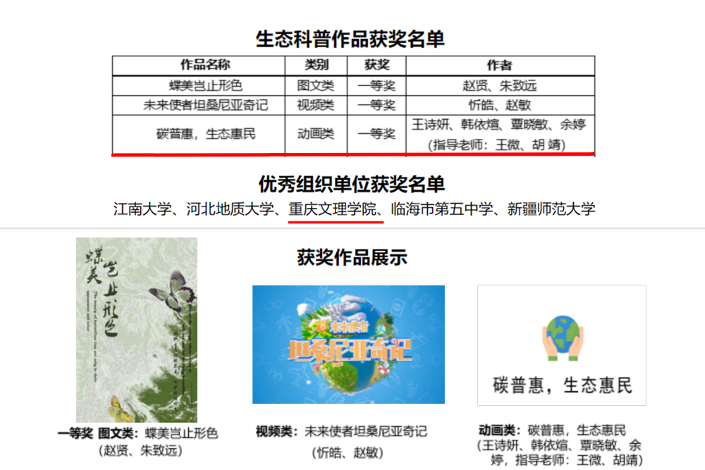 近日,由中国生态学学会公布了第五届“关注绿色发展,建设生态文明”生态科普作品大赛获奖名单。园林与生命科学学院学子王诗妍、韩依煊、覃晓敏、余婷等在王微、胡靖老师指导下,其动画类作品《碳普惠,生态惠民》荣获一等奖;同时,学校被评为“优秀组织单位”。这是beat365继2023年获得第四届生态科普作品大赛二等奖之后的又一次突破。