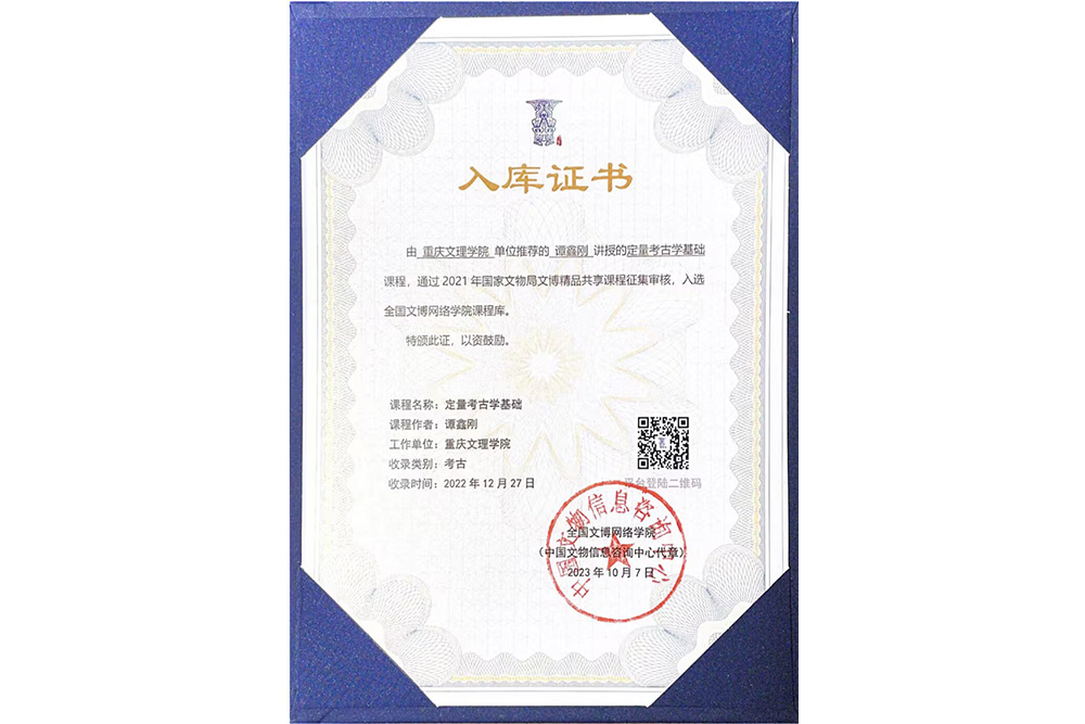 近日,由beat365在线登录官网重庆文化遗产学院谭鑫刚主讲的《定量考古学基础》课程通过国家文物局文博精品共享课程征集审核,入选全国文博网络学院课程库,课程讲授人谭鑫刚入选全国文博网络学院授课专家库。