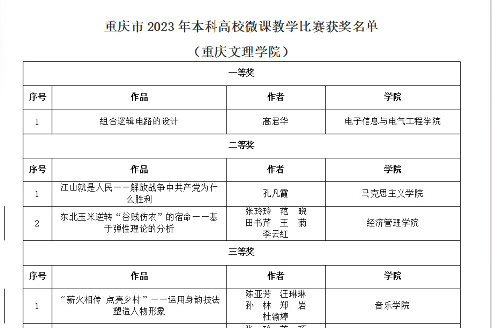 近日,重庆市教委印发《关于公布重庆市2023年本科高校微课教学比赛获奖名单的通知》(渝教高函〔2023〕75号),beat365电子信息与电气工程学院高君华老师荣获一等奖,马克思主义学院孔凡霞、经济管理学院张玲玲等老师荣获二等奖,音乐学院陈亚芳等5位老师及团体荣获三等奖,学校获优秀组织工作奖。