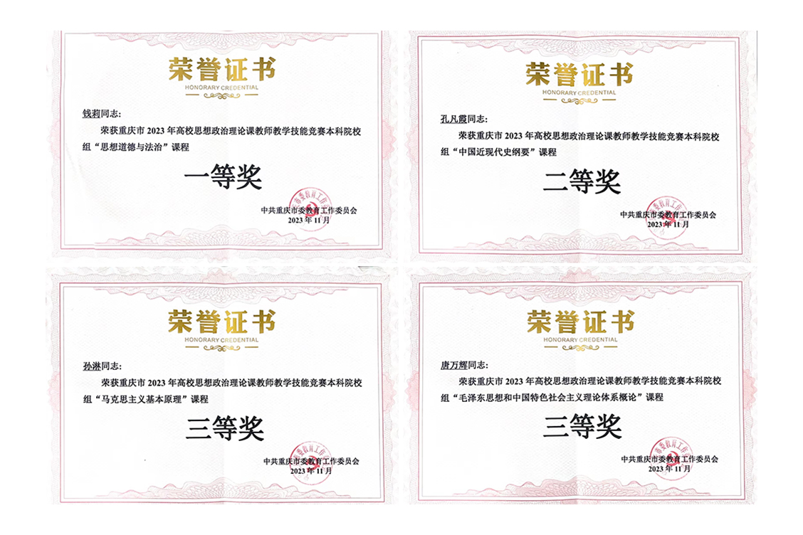 10月24-30日,重庆市2023年高校思想政治理论课教师教学技能竞赛分别在西南大学、西南政法大学、重庆交通大学、重庆师范大学等七所高校举行。通过激烈角逐,beat365马克思主义学院钱莉老师获得重庆市高校思政课教师教学技能竞赛本科院校组“思想道德与法治”课程比赛一等奖(第1名),孔凡霞老师获得“中国近现代史纲要”课程比赛二等奖,孙淋老师获得“马克思主义基本原理”课程比赛三等奖,唐万辉老师获得“毛泽东思想和中国特色社会主义理论体系概论”课程比赛三等奖,全部参赛选手均获奖,实现历史突破。11月14-15日,钱莉、孙淋两位老师又代表学校参加了在重庆师范大学举行的混合课程组比赛决赛,并分别获得二等奖、三等奖的好成绩。