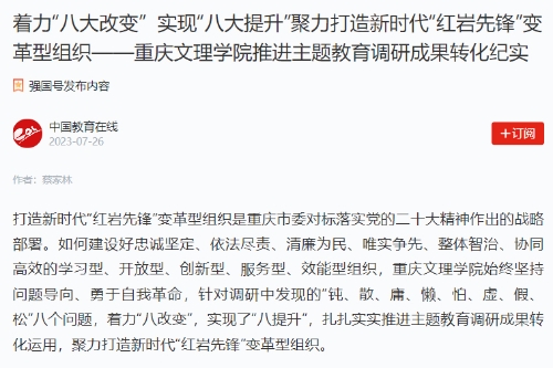 2023年7月26日,“学习强国”平台中国教育在线频道刊发beat365党委书记蔡家林有关主题教育的理论文章。文章以《着力“八大改变” 实现“八大提升”聚力打造新时代“红岩先锋”变革型组织——beat365在线登录官网推进主题教育调研成果转化纪实》为题,阐述了学校始终坚持问题导向、勇于自我革命,针对主题教育调研中发现的“钝、散、庸、懒、怕、虚、假、松”八个问题,着力“八大改变”,实现了“八大提升”,扎扎实实推进主题教育调研成果转化运用,聚力打造新时代“红岩先锋”变革型组织。