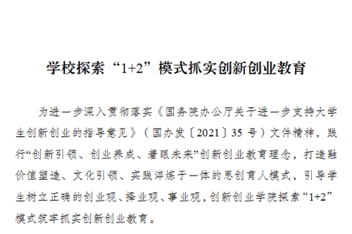 为进一步深入贯彻落实《国务院办公厅关于进一步支持大学生创新创业的指导意见》(国办发〔2021〕35号)文件精神,践行“创新引领、创业养成、着眼未来”创新创业教育理念,打造融价值塑造、文化引领、实践淬炼于一体的思创育人模式,引导学生树立正确的创业观、择业观、事业观,创新创业学院探索“1+2”模式筑牢抓实创新创业教育。