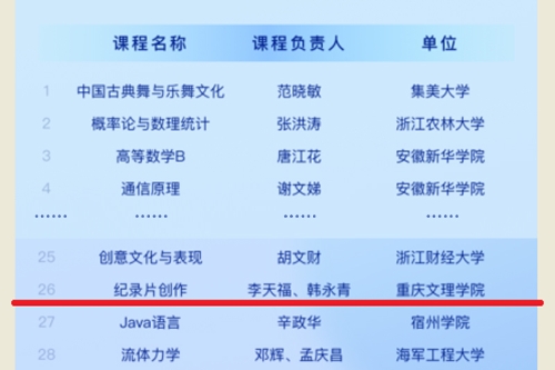 近日,教育部在线教育研究中心公布了2022年“拓金计划”示范课程入选名单,beat365李天福教授和韩永青教授为负责人的国家级一流本科课程《纪录片创作》成功入选,成为重庆市高校第2门入选该计划的课程。
