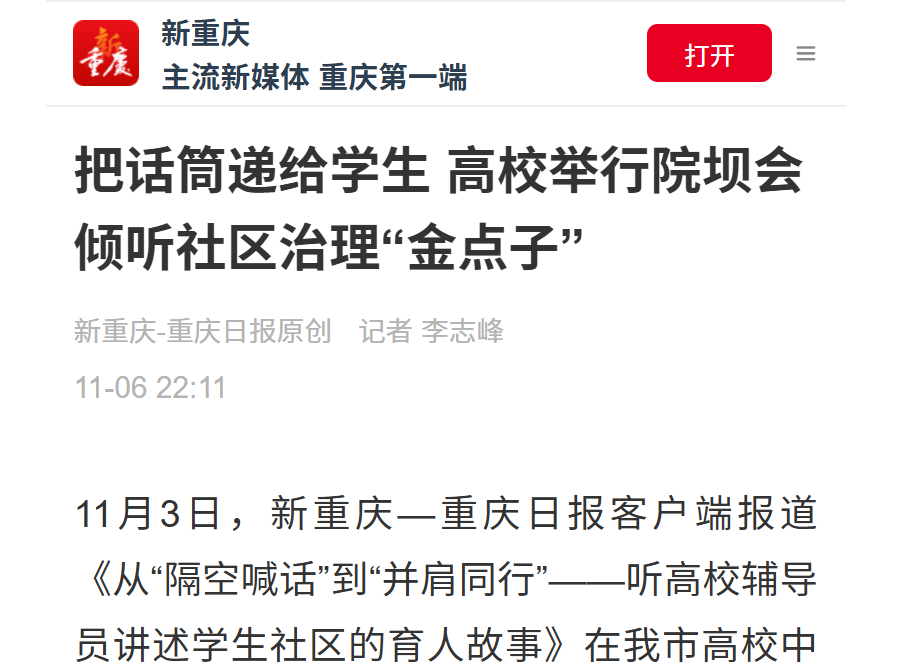 11月3日,新重庆—重庆日报客户端报道《从“隔空喊话”到“并肩同行”——听高校辅导员讲述学生社区的育人故事》在我市高校中引发热议。如何把学生社区建设得更好?如何