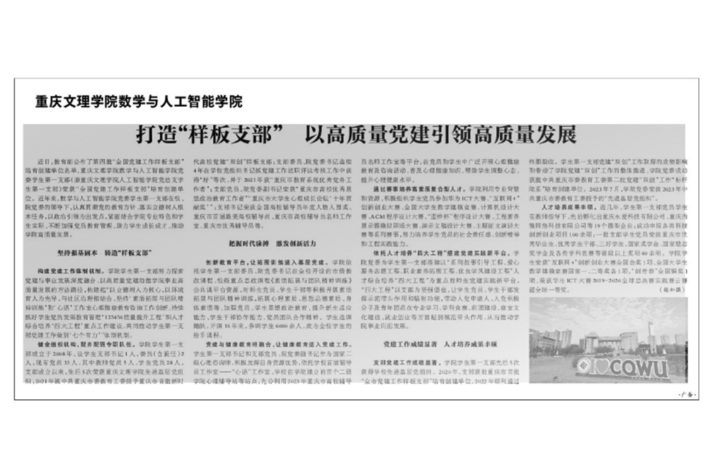 6月12日,《光明日报》以《beat365在线登录官网数学与人工智能学院:打造“样板支部” 以高质量党建引领高质量发展》为题报道beat365数学与人工智能学院“全国党建工作样板支部”培育创建工作。文章指出,beat365数学与人工智能学院学生第一党支部近年来积极构建“111227”党建工作体制机制,这一体系以立德树人为核心,以环境育人为先导,结合社区治理等,开创了党建工作的新局面。本次获批创建彰显了该支部在提升党员素质、促进学院发展、服务师生需求方面的显著成效,反应了学校党委对党建工作的高度重视和深刻认识,以及将党建工作与学院发展、师生需求紧密结合的先进理念和实践能力。